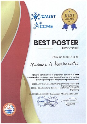 Ερευνητική εργασία που εκπονήθηκε στο Εργαστήριο Φυσικοχημείας & Χημικών Διεργασιών της Σχολής Χημικών Μηχανικών & Μηχανικών Περιβάλλοντος του Πολυτεχνείου Κρήτης, με Διευθυντή τον Καθηγητή Ιωάννη Γεντεκάκη, σε συνεργασία με το Εργαστήριο «Κεραμικών και Σύνθετων Υλικών» του Τμήματος Μηχανικών Επιστήμης Υλικών του Πανεπιστημίου Ιωαννίνων, με Διευθυντή τον Καθηγητή Μιχαήλ Καρακασίδη, τιμήθηκε με το Βραβείο Καλύτερης Παρουσίασης σε Poster (Best Award, Best poster presentation) στο 14th International Conference on Material Science and Engineering Technology (ICMSET 2025), που πραγματοποιήθηκε στις 21-24 Νοεμβρίου, 2025, στην Οζάκα, Ιαπωνίας.