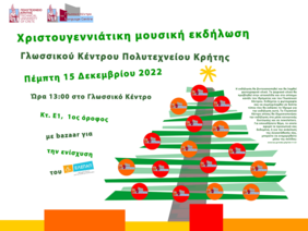 Το Γλωσσικό Κέντρο του Πολυτεχνείου Κρήτης σας προσκαλεί στην Χριστουγεννιάτικη Μουσική Εκδήλωση που διοργανώνει την Πέμπτη 15 Δεκεμβρίου 2022 και ώρα 13:00 στην κεντρική αίθουσα του Γλωσσικού Κέντρου, στο Κτήριο Ε1, στον 1ο όροφο. Στην εκδήλωση θα συμμετάσχει η ΕΛΕΠΑΠ - Παράρτημα Χανίων με τη διεξαγωγή εορταστικού bazaar για την ενίσχυση των δράσεών της.