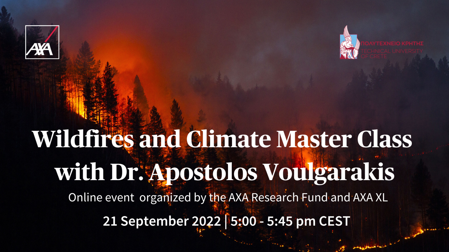 Την Τετάρτη 21 Σεπτεμβρίου 2022 στις 6μ.μ. (ώρα Ελλάδας), το AXA Research Fund και η AXA XL διοργανώνουν ένα διαδικτυακό masterclass με τον Δρ. Απόστολο Βουλγαράκη, Αναπληρωτή Καθηγητή της Σχολής Χημικών Μηχανικών και Μηχανικών Περιβάλλοντος (ΧΗΜΗΠΕΡ) και κάτοχο της έδρας της ΑΧΑ στις πυρκαγιές και το κλίμα στο Πολυτεχνείο Κρήτης.