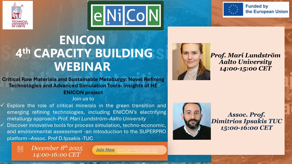Tο Εργαστήριο Διαχείρισης Μεταλλευτικών και Μεταλλουργικών Αποβλήτων και Αποκατάστασης Εδαφών της Σχολής Μηχανικών Ορυκτών Πόρων του Πολυτεχνείου Κρήτης, με την υποστήριξη του Ευρωπαϊκού έργου Horizon Europe ΕΝΙCON*, διοργανώνουν διαδικτυακό σεμινάριο, με τίτλο “Critical Raw Materials and Sustainable Metallurgy: Novel Refining Technologies and Advanced Simulation Tools”