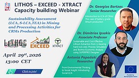 Στο πλαίσιο των Ευρωπαϊκών έργων HE LITHOS, EXCEED και XTRACT, στα οποία συμμετέχει το Πολυτεχνείο Κρήτης, συνδιοργανώνεται διαδικτυακό σεμινάριο με τίτλο “Sustainability Assessment (LCA, S-LCA, TEA) in Mining and Processing Activities for CRMs Production”,την Τετάρτη 29 Απριλίου 2026 και ώρα 13:00 (CET).