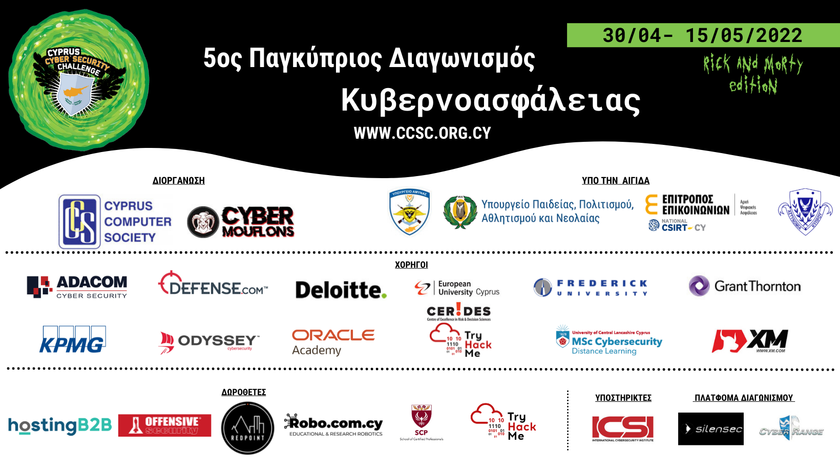 Η διοργάνωση CCSC 2022 τελούσε υπό την αιγίδα του Υπουργείου Άμυνας της Κύπρου, του Υπουργείου Παιδείας Πολιτισμού, Αθλητισμού και Νεολαίας της Κύπρου, της Αστυνομίας Κύπρου και της Αρχής Ψηφιακής Ασφάλειας μέσω του Γραφείου του Επιτρόπου Επικοινωνιών της Κύπρου. Oι χορηγοί της διοργάνωσης ήταν: Adacom Cyber Security, Defense.com, Deloitte, European University Cyprus, Exness, Frederick University, Grant Thornton, KPMG, Odyssey Cyebersecurity, Oracle Academy, Try Hack Me, University of Central Lancaster Cyprus και XM καθώς και στους υποστηρικτές ΗostingB2B, MVPS.net, ICSI, Offensive Security, RedPoint, Robo Cy and SCP Academy, Silensec, Cyber Ranges.