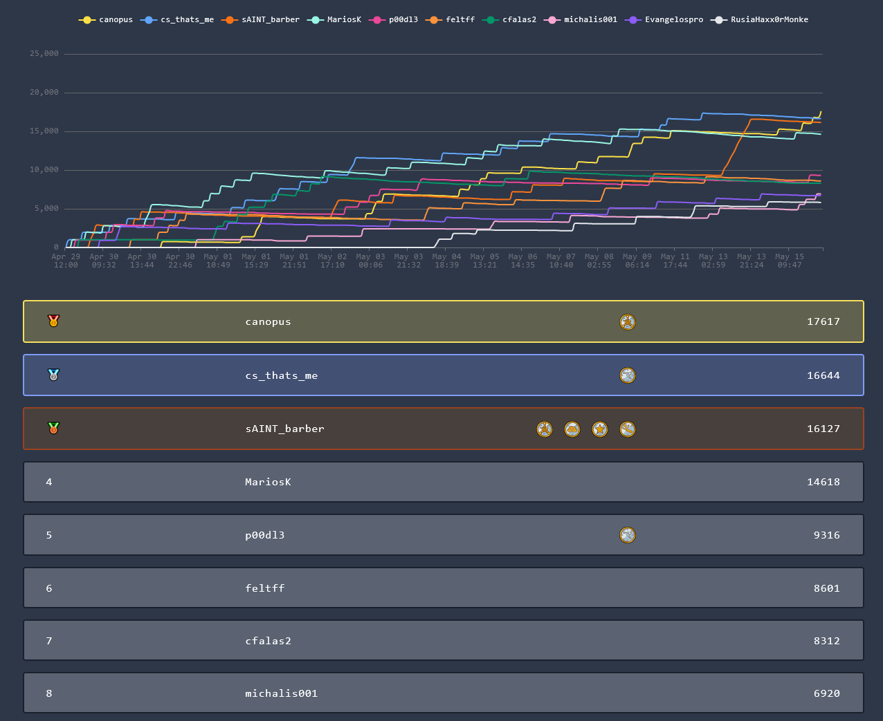 Όπως φαίνεται στον αναλυτικό πίνακα βαθμολογίας του διαγωνισμού, η συμμετοχή Canopus του Οδυσσέα Σταύρου έλυσε τα 24 από τα 42 challenges, περισσότερα από κάθε άλλη συμμετοχή, και συγκέντρωσε 17.617 μονάδες, ξεπερνώντας κυριολεκτικά λίγο πριν το νήμα (την τελευταία ημέρα) τις δύο αντίπαλες συμμετοχές που κατέλαβαν τελικά την 2η και 3η θέση αντίστοιχα.