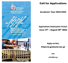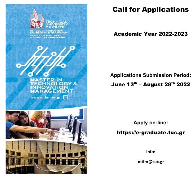 MTIM is an interdisciplinary MSc program offered by the Technical University of Crete, of a minimum duration of one (1) academic year for the full-time program and two (2) academic years for the part-time program. It is coordinated by the School of Production Engineering and Management with the collaboration of the School of Electrical and Computer Engineering. The program may include an optional summer internship - Startup Nation Study Trip.