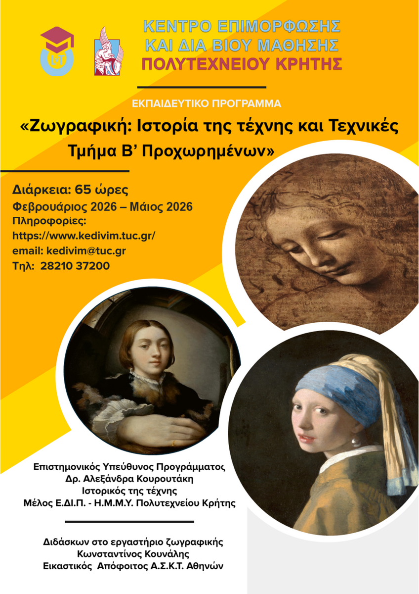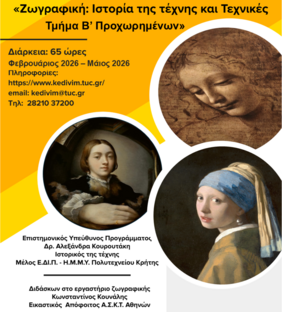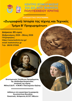 Το Κέντρο Επιμόρφωσης και Διά Βίου Μάθησης (ΚΕΔΙΒΙΜ) του Πολυτεχνείου Κρήτης ανακοινώνει την έναρξη νέου Εκπαιδευτικού Προγράμματος με τίτλο: “Ζωγραφική: Ιστορία της τέχνης και Τεχνικές. Τμήμα Β `Προχωρημένων”