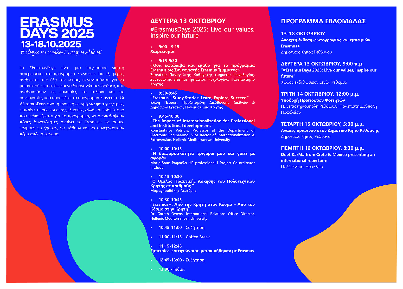 - Δευτέρα 13/10, 09:00, Ρέθυμνο: Ημερίδα με θέμα “#ErasmusDays 2025: Live our values, inspire our future” στον εκθεσιακό χώρο «Ξενία».