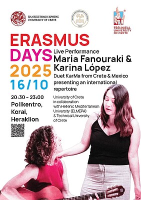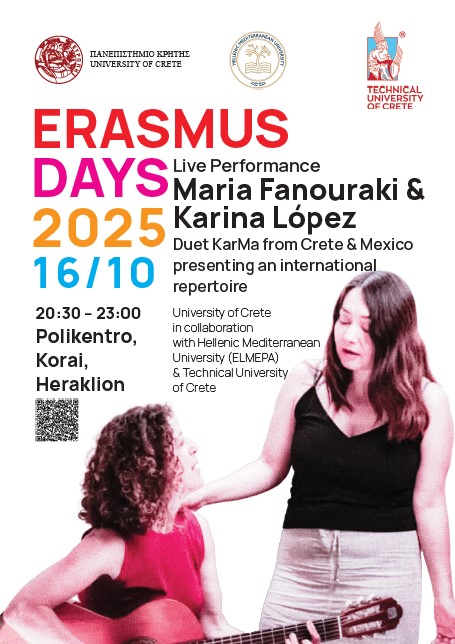 - Πέμπτη 16/10, 20:30 – 23:00, Ηράκλειο: Μουσική εκδήλωση με το ντουέτο “KarMa” (Μαρία Φανουράκη & Karina López) από την Κρήτη και το Μεξικό, που θα παρουσιάσει ένα διεθνές ρεπερτόριο. Η εκδήλωση θα λάβει χώρα στο Πολύκεντρο Νεολαίας (Κοραή).