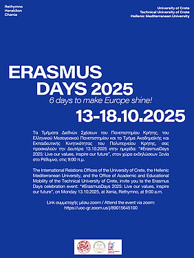 Tο Τμήμα Ακαδημαϊκής και Εκπαιδευτικής Κινητικότητας του Πολυτεχνείου Κρήτης (ERASMUS+) από κοινού με τα Τμήματα Διεθνών Σχέσεων του Πανεπιστημίου Κρήτης και του Ελληνικού Μεσογειακού Πανεπιστημίου διοργανώνουν σειρά εκδηλώσεων στο πλαίσιο του εορτασμού των “Erasmus Days 2025”.