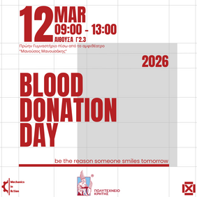 Εθελοντική Αιμοδοσία διοργανώνει το Πολυτεχνείο Κρήτης σε συνεργασία με τη φοιτητική ομάδα Mechanics in Action και το Τμήμα Αιμοδοσίας του Γενικού Νοσοκομείου Χανίων «Ο Άγιος Γεώργιος».