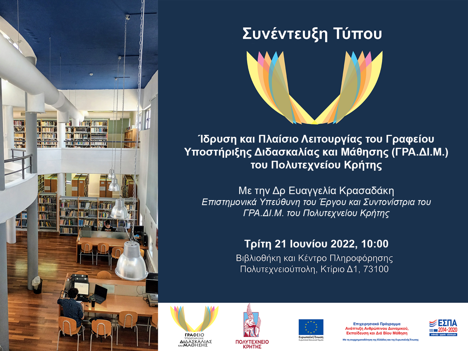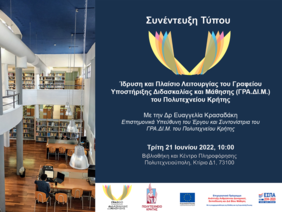 Την Τρίτη 21 Ιουνίου 2022 στις 10:00, στον χώρο της Βιβλιοθήκης και Κέντρου Πληροφόρησης του Ιδρύματος, θα δοθεί συνέντευξη τύπου σχετικά με την ίδρυση και λειτουργία του ΓΡΑ.ΔΙ.Μ. του Πολυτεχνείου Κρήτης για τους δημοσιογράφους και τα μέσα μαζικής ενημέρωσης.