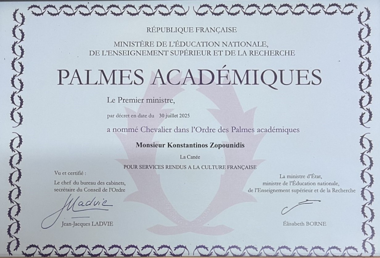 Το Τάγμα του Ακαδημαϊκού Φοίνικα ( l'Ordre des Palmes Académiques), η αρχαιότερη διάκριση που θεσπίστηκε το 1808 από τον Ναπολέοντα Α’, απονέμεται σε πολίτες που διακρίθηκαν για την προσφορά τους στην εκπαίδευση, την έρευνα, τον πολιτισμό και την ανάδειξη της πολιτιστικής κληρονομιάς.