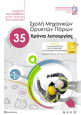 Στο πλαίσιο του εορτασμού για τα 35 χρόνια λειτουργίας της, η Σχολή Μηχανικών Ορυκτών Πόρων του Πολυτεχνείου Κρήτης διοργανώνει ημερίδα για την απασχόληση και τις προοπτικές των αποφοίτων της Σχολής στις 14 Δεκεμβρίου 2022 και ώρα 13:00-15:30.