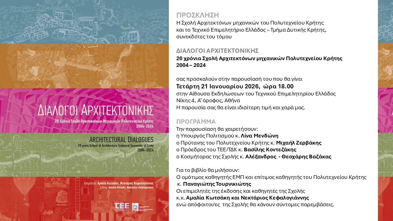 Η Σχολή Αρχιτεκτόνων Μηχανικών του Πολυτεχνείου Κρήτης και το Τεχνικό Επιμελητήριο Ελλάδας-Τμήμα Δυτικής Κρήτης (ΤΕΕ/ΤΔΚ) παρουσιάζουν τον Συλλογικό Τόμο