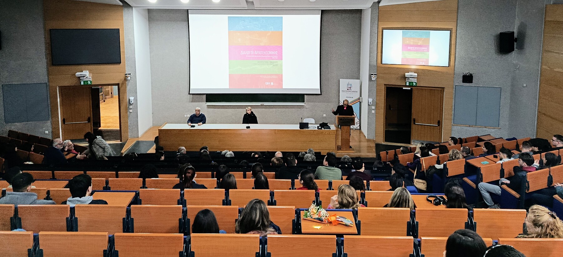 Τέλος, σύντομες παρεμβάσεις έκαναν οι απόφοιτοι της Σχολής Αρχιτεκτόνων Μηχανικών του Πολυτεχνείου Κρήτης Αικατερίνη Καραδήμα, Ευάγγελος Κωλέτσης και Αντώνης Καραμήτρου.