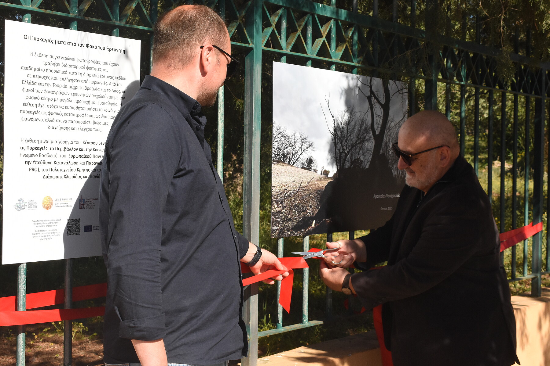 Τα εγκαίνια της φωτογραφικής έκθεσης με τίτλο "Οι Πυρκαγιές Μέσα από τον Φακό του Ερευνητή" ανέδειξαν την παγκόσμια διάσταση του θέματος και παρουσίασαν βιώσιμες μεθόδους διαχείρισης και ελέγχου των δασικών πυρκαγιών. Οι οκτώ φωτογραφίες που κοσμούν την είσοδο του Πάρκου έχουν ληφθεί από διδακτορικούς φοιτητές και ακαδημαϊκό προσωπικό κατά τη διάρκεια έρευνας πεδίου σε περιοχές που επλήγησαν από πυρκαγιές. Από την Τουρκία και την Ελλάδα μέχρι τη Βραζιλία και το Λάος, οι ερευνητικοί φακοί των φωτογράφων-ερευνητών ασχολούνται με τον φυσικό κόσμο με μεγάλη προσοχή, ενσυναίσθηση και ευαισθησία. Η συλλογή ευαισθητοποιεί όχι μόνο σχετικά με τις πυρκαγιές ως φυσικές καταστροφές σε παγκόσμια κλίμακα, αλλά παρουσιάζει και βιώσιμες μεθόδους διαχείρισης και ελέγχου τους. Η έκθεση κατέστη δυνατή χάρη στη συνεργασία του Πάρκου Διάσωσης Χλωρίδας και Πανίδας και του Πολυτεχνείου Κρήτης με την ομάδα EURECA-PRO TUC και το Κέντρο Leverhulme για τις Πυρκαγιές, το Περιβάλλον και την Κοινωνία (Λονδίνο). Τα εγκαίνια της έκθεσης προλόγισαν με δύο σύντομες εισηγήσεις ο Δρ. Ευάγγελος Διαμαντόπουλος, Ομότιμος Καθηγητής της Σχολής Χημικών και Μηχανικών Περιβάλλοντος και Επιστημονικά Υπεύθυνος του EURECA-PRO TUC, καθώς και ο Δρ. Απόστολος Βουλγαράκης, Καθηγητής της Σχολής Χημικών και Μηχανικών Περιβάλλοντος και Αναπληρωτής Διευθυντής του Κέντρου Leverhulme.