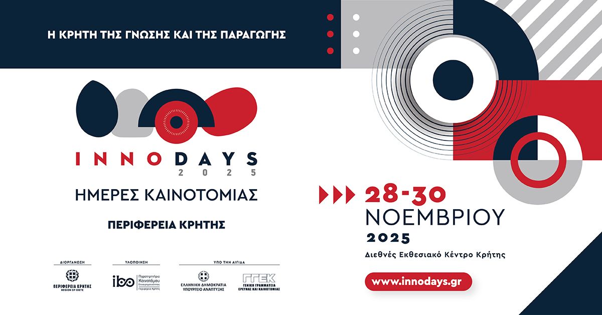 Το Πολυτεχνείο Κρήτης συμμετέχει και φέτος στις Ημέρες Καινοτομίας Περιφέρειας Κρήτης – InnoDays – «Η Κρήτη της Γνώσης και της Παραγωγής», που διοργανώνονται από το Παρατηρητήριο Καινοτόμου Επιχειρηματικότητας Περιφέρειας Κρήτης, 28-30 Νοεμβρίου 2025, στο Διεθνές Εκθεσιακό Κέντρο Κρήτης, στις Γούρνες Ηρακλείου.