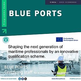 Το BLUE PORTS (BLUE CAREERS IN NET ZERO ENERGY PORTS) στηρίζει την πράσινη μετάβαση των λιμένων, αναπτύσσοντας ένα εξειδικευμένο σχήμα κατάρτισης και πιστοποίησης του ανθρώπινου δυναμικού, το οποίο καλύπτει πράσινες, βιώσιμες λύσεις, και ενσωματώνει περιβαλλοντικά φιλικά προϊόντα και υπηρεσίες για την επίτευξη κλιματικής ουδετερότητας, με εστίαση σε μικρά και μεσαία λιμάνια. Διαμορφώνει έτσι ανταγωνιστικό πλεονέκτημα και επαγγελματικά προσόντα, και συμβάλει σε ενισχυμένη ασφάλεια και απόδοση, βελτιωμένες ευκαιρίες σταδιοδρομίας και κινητικότητας, καθώς και νέες, πράσινες θέσεις εργασίας στο λιμενικό κλάδο. Το καινοτόμο σχήμα πιστοποίησης BLUE PORTS, που συμμορφώνεται με το πρότυπο ISO / IEC 17024, θα δοκιμαστεί και θα επικυρωθεί σε επιλεγμένα λιμάνια της Μεσογείου και του Εύξεινου Πόντου και θα προωθηθεί για αμοιβαία αναγνώριση σε ολόκληρη την Ευρώπη. Στα αναμενόμενα αποτελέσματα περιλαμβάνεται η δημιουργία ψηφιακού εκπαιδευτικού υλικού και η κατάρτιση περισσότερων από 200 επαγγελματιών και 150 νέων ταλέντων.