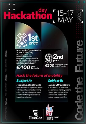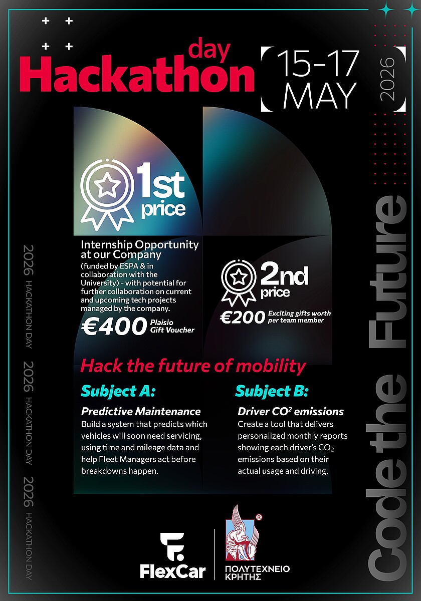 Η FlexCar σε συνεργασία με το Πολυτεχνείο Κρήτης διοργανώνει ένα δυναμικό τριήμερο Hackathon με στόχο την ανάπτυξη καινοτόμων λύσεων στον τομέα της Έξυπνης Κινητικότητας από 15 έως 17 Μαΐου 2026, στην Πολυτεχνειούπολη, με θέμα: